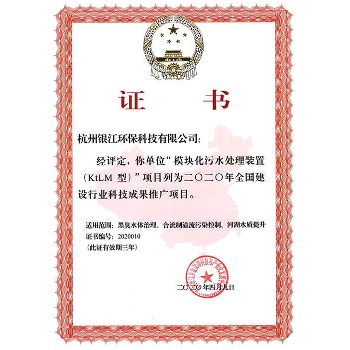 該技術在住房和城鄉建設部科技與產業化發展中心主持召開的“模塊化污水處理裝置(KtLM型)”科技成果評估會上, 評估委員會專家一致認為:該項目開發的與MBBR工藝相結合的浮選沉淀工藝具有創新性,達到國內領先水平,同意通過評估,并被列入2020年全國建設行業科技成果推廣項目。
